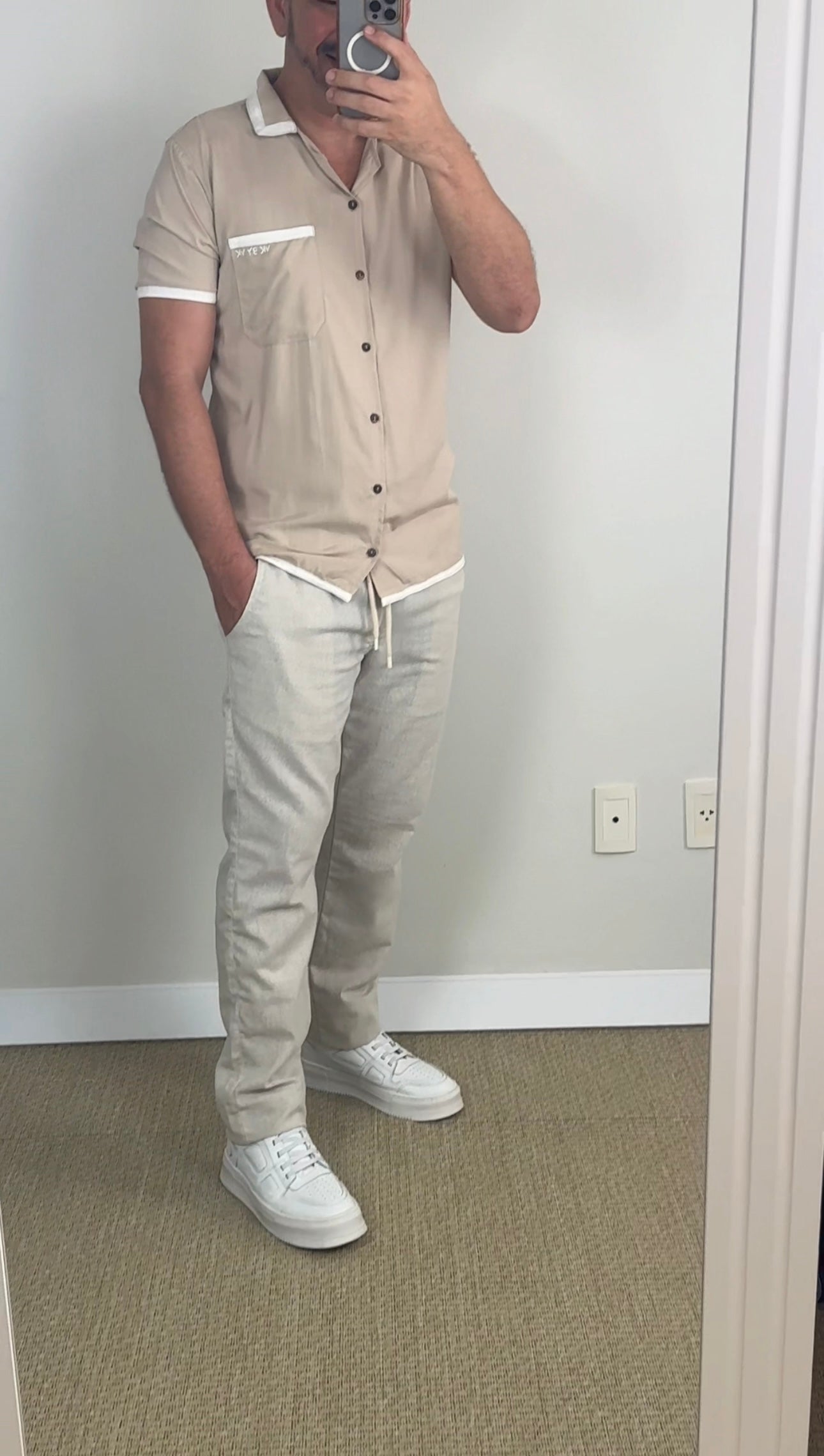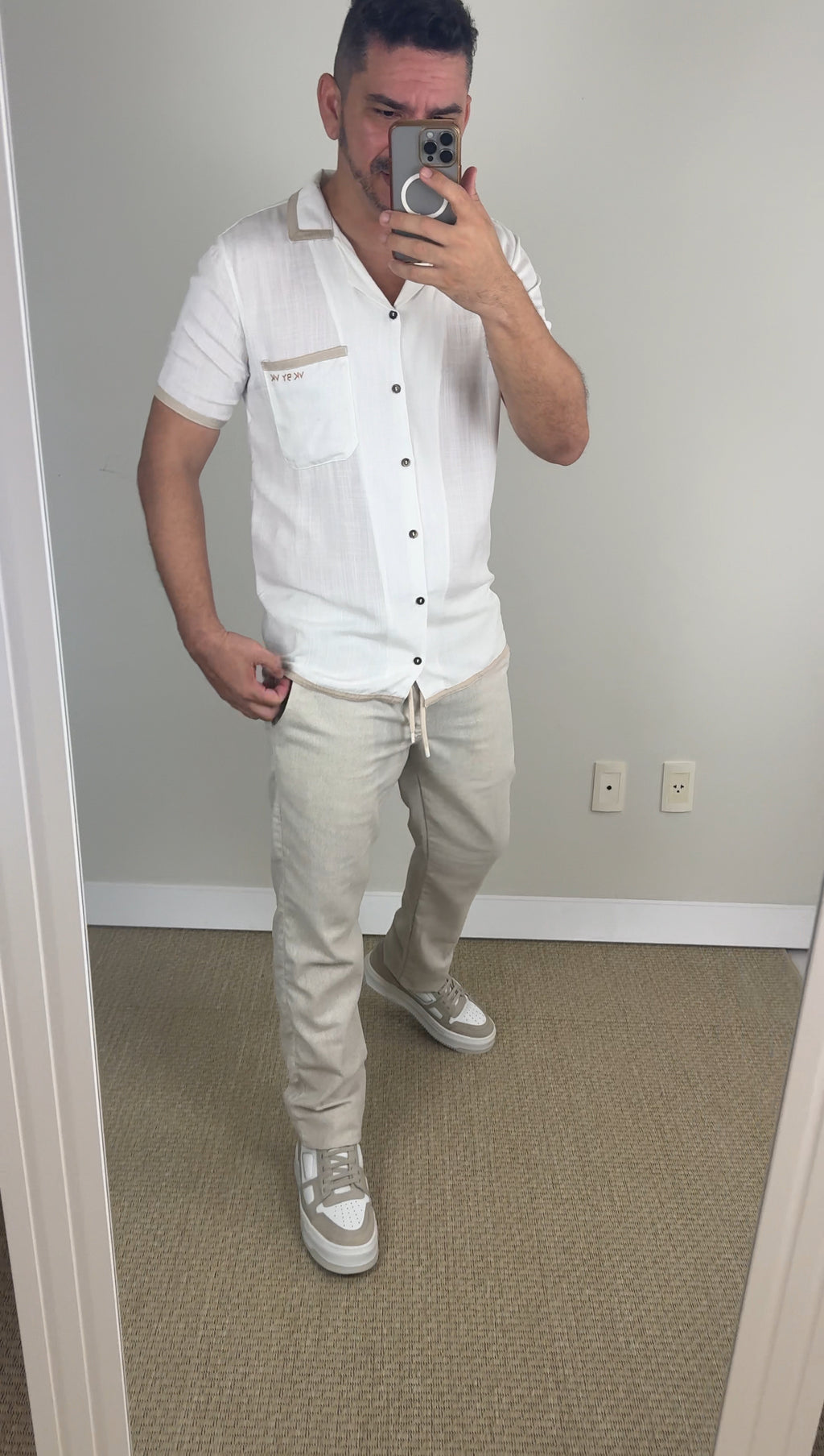 Disponível nas cores off-white e bege, essa camisa é a escolha perfeita para momentos casuais ou eventos à beira-mar. Sua versatilidade permite combinações elegantes com calças ou shorts, garantindo um visual alinhado e descontraído.